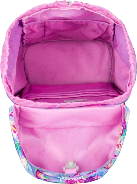 Rygsækkens enkeltkammer-indretning med mappe-lomme giver overblik, forlommen rummer sikkert madkassen, og sidelommer med elastik holder flasken på plads. Magnetlukningen er let at betjene for begyndere. Penalhuset med to flapper er overskueligt og robust, klar til at blive fyldt. Posen af stærkt, aftørringsvenligt materiale har en nederste lynlåslomme, karabinhage til fastgørelse på rygsækken og snorelukning, så den kan bæres behageligt på ryggen.