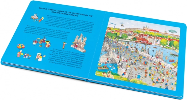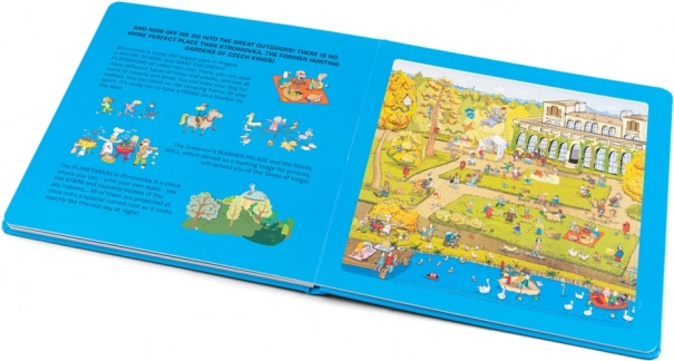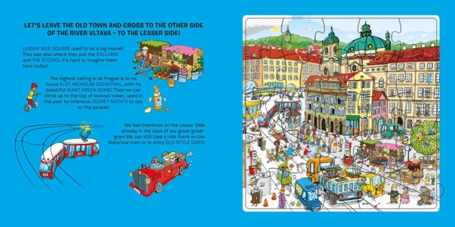 En praktisk visning af, hvordan dine børn legende kan udforske Prag ved at lægge puslespil på hver side af bogen.