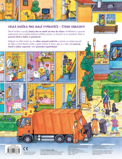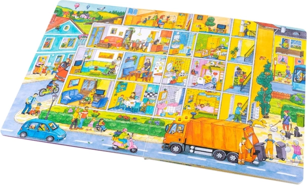 Denne storformatbog er ideel til fælles læsning og fortælling. Børn lærer, hvad der sker i byen fra morgen til aften – fra skraldemændenes arbejde og indkøb, over børnehave, byggeplads, brandvæsen og politi, til eftermiddagens leg i parken og udflugter til søen eller gården. Hver side er fuld af anledninger til samtale og til at lede efter detaljer.