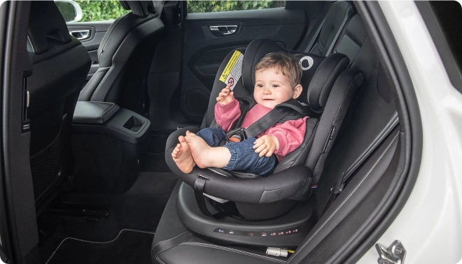 Med én bevægelse drejer du sædet mod døren, spænder barnet behageligt fast og vælger kørselsretning efter behov. Komfort og sikkerhed i hverdagen.