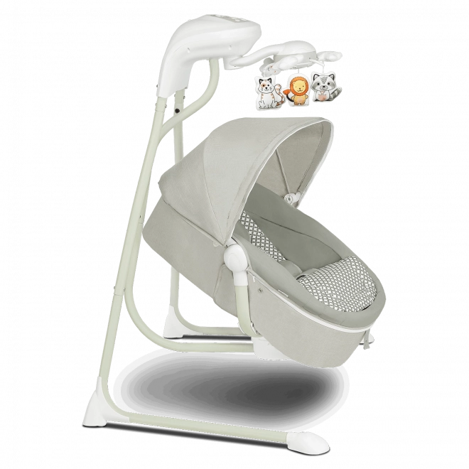 Indsatsen tilbyder 3 justerbare positioner fra liggende til siddende, drejning af liften op til 115° og en komfortabel indsats med aftagelig polstring for nem rengøring. Den integrerede karrusel med legetøj og lys, MP3-afspiller med USB og vuggetimer sørger for både underholdning og komfort. Et praktisk myggenet beskytter mod insekter og muliggør brug udendørs.