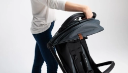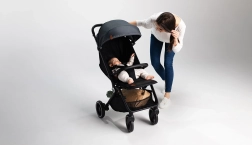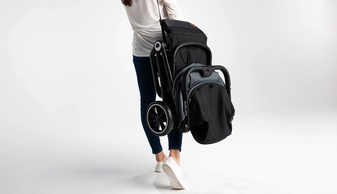 Med et tryk på en knap klapper du klapvognen sammen til en kompakt form, og takket være bærestroppen kan den nemt bæres over skulderen – ideel i byen og på rejser.