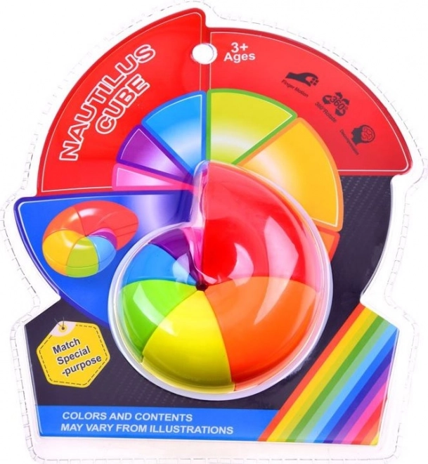Farverig roterende spiral i form af et sneglehus. Hver af de syv farvede sektioner består af tre dele. - Bland ved at dreje og saml Nautilus tilbage til sin oprindelige form - udvikler finmotorik, logik og strategi - høj kvalitet og holdbar udførelse Pakken indeholder en illustrated vejledning. Mål på det samlede puslespil ca. 8,5 x 6 cm