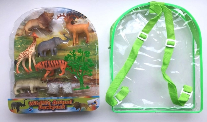 Sjovt sæt med 6 figurer af vilde dyr i en praktisk rygsæk: løve, tiger, hjort, næsehorn, elefant og giraf med tilbehør. Den gennemsigtige rygsæk med justerbare stropper gør det nemt at bære og opbevare; figurerne måler ca. 8 × 5 × 3 cm.