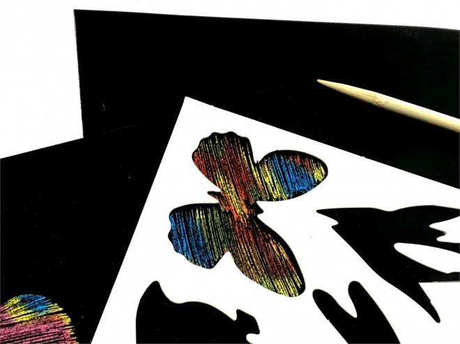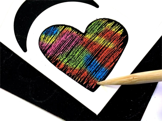 Dette kreative sæt er perfekt til både små og store kunstnere. Det sorte lag på papiret skjuler en farverig regnbuebaggrund, der kommer til syne, når du skraber med den medfølgende træstylus. Takket være skabelonerne skaber du nemt rene former og dekorationer – eller kast dig ud i fri hånd.