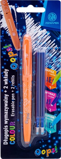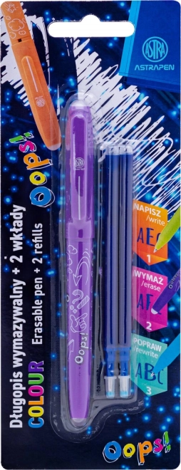 Praktisk viskelærpen ASTRA OOPS! med fin stregbredde på 0,6 mm er ideel til skole og kontor. Indeholder en særlig blæk, der let kan viskes ud i begge ender af pennen, og takket være det ergonomiske greb giver den behagelig skrivning uden træthed. Pakken indeholder 2 ekstra refiller for længere holdbarhed.