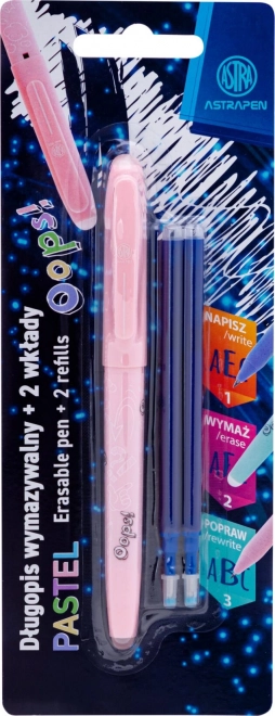 Den praktiske viskelær-pen Astra Oops med fin stregbredde på 0,6 mm giver glidende skrivning og hurtige rettelser takket være den særlige blæk, som kan viskes ud fra begge ender af pennen. Den tilbyder ergonomisk greb, skridsikkert korpus og udskiftbar blå patron. Ideel til skole, kontor og hjem.