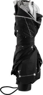 En stilfuld, sammenklappelig paraply med sølvfarvet yderside og indvendigt motiv af stjernebilleder, der kombinerer lethed, kompakte mål og pålidelig beskyttelse mod regn. Med en længde på kun 25 cm i sammenfoldet tilstand passer den nemt i håndtaske eller rygsæk og er ideel til daglig brug.
