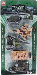 Komplet militærsæt med 5 dele til actionfyldt leg: helikopter, to jagerfly, en tank og en bil. Legetøjet har pull-back og friløbshjul for jævn bevægelse og langvarig underholdning.