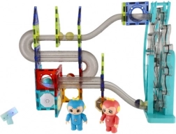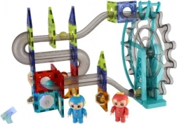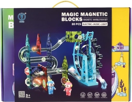 Dette farverige byggesæt gør det nemt for børn at forbinde magnetiske dele og skabe unikke baner til kuglerne. Når ruten er bygget, begynder spændingen – når kuglerne fra start til mål? De søde figurer Nink og Wink holder øje med en sikker landing. Det integrerede elektriske hjul fungerer som elevator for kuglerne og tilføjer lys- og lydeffekter, som kan slås fra efter behov.