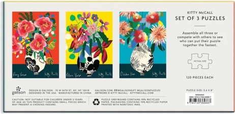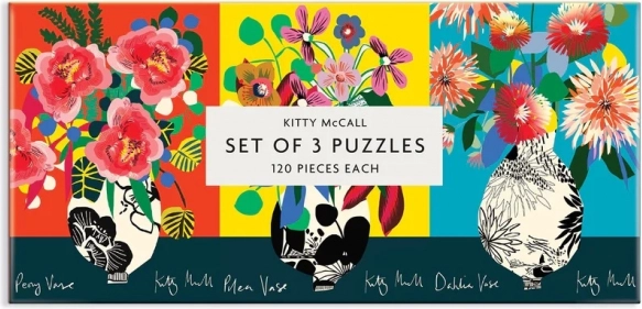 Kitty McCall puzzlesættet indeholder tre puslespil med 120 brikker, med iøjnefaldende farverige illustrationer af blomsterarrangementer i vaser af kunstneren Kitty McCall, en britisk kunstner med rødder i Nigeria. Inspireret af naturen omkring sig og de pulserende landskaber fra sin tidlige barndom i Nigeria har Kitty McCall udviklet en karakteristisk stil med dristige farver, overlappende mønstre og former, som skaber geometriske mønstre og blomsterlandskaber til interiører og accessories. Den ydre æske har magnetlukning. Puslespillene er pakket i en solid æske, velegnet til genbrug og opbevaring. Ideelt som gave. Motivet er skabt af Kitty McCall. Puslespillene er fremstillet med en betydelig andel genbrugspapir og trykt med ugiftige farver i topkvalitet. De har en mat overflade, som under alle omstændigheder sikrer trofast gengivelse af både detaljer og farver. Bagsiden er belagt med en glat, behagelig overflade, som forhindrer, at der dannes støv ved opbevaring af et halvlagt puslespil. Sammen med de omhyggeligt pakkede brikker finder du også en folder med referencebillede, som typisk indeholder yderligere information om skabere og værkets baggrund. Leveres i en usædvanligt robust og flot udført kartonæske af genbrugskarton. Vigtigste egenskaber: 120 præcist udskårne brikker, fremstillet af genbrugte og bæredygtigt indvundne materialer, nøje udvalgt motiv fra anerkendte skabere og kunstnere, tryk og udførelse i højeste kvalitet, indeholder referencebillede
