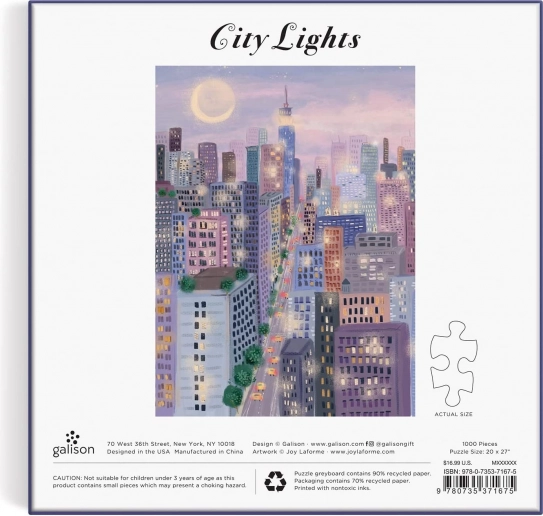 Puslespillet Byens lys er designet af den anerkendte kunstner Joy Laforme og byder på en smuk natlig byscene. I æsken finder du: