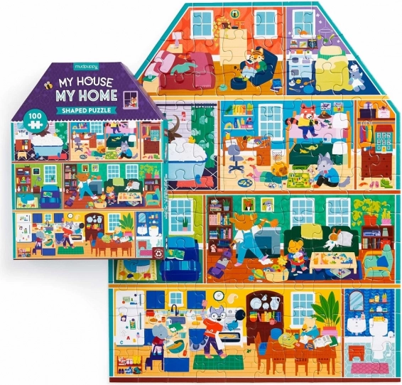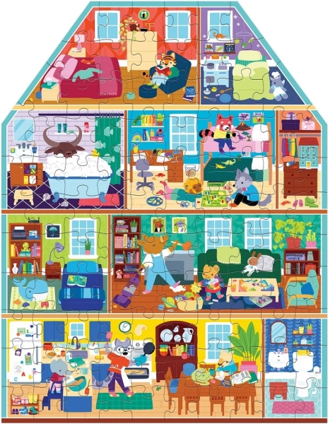 Husformet design gør puslespillet attraktivt for børn, med farverige illustrationer af de enkelte rum.