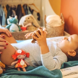 Broderede øjne, kinder og mund uden små dele sikrer tryg leg allerede fra fødslen. Bomuldsansigtet er behageligt at røre ved.