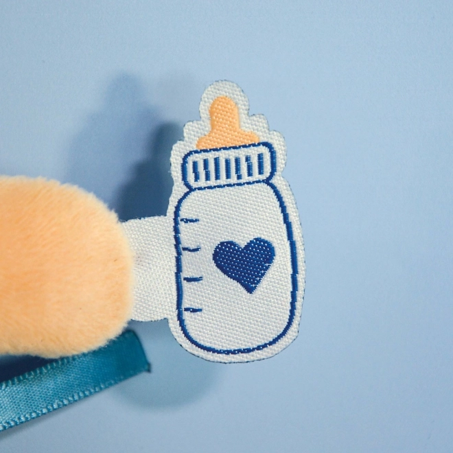 Blød mini-dukke Doudou Jolijou 18 cm i blå. Skånsomme materialer, broderede detaljer, flaske i hånden, vask ved 30 °C, egnet fra fødslen, opfylder CE.