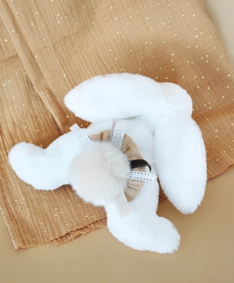 Det stilfulde detalje i form af en beige pompombold og et tørklæde om halsen understreger legetøjets moderne udtryk. Bunnyen leveres i en elegant gaveæske – ideel til babyshower, fødsel, dåb eller som en kær gave til enhver lejlighed.