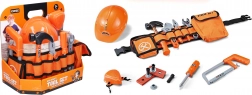 Praktisk børnesæt til små reparatører indeholder alt nødvendigt til sikker leg og de første “gør‑det‑selv”-forsøg. Med tekstilbælte for behagelig bæring af værktøj, hjelm og rigt udstyr: maske, sav, hammer, kombinationstænger, rørtang, skruetrækker, nøgle, 2 træstykker, 3 skruer og 3 møtrikker.