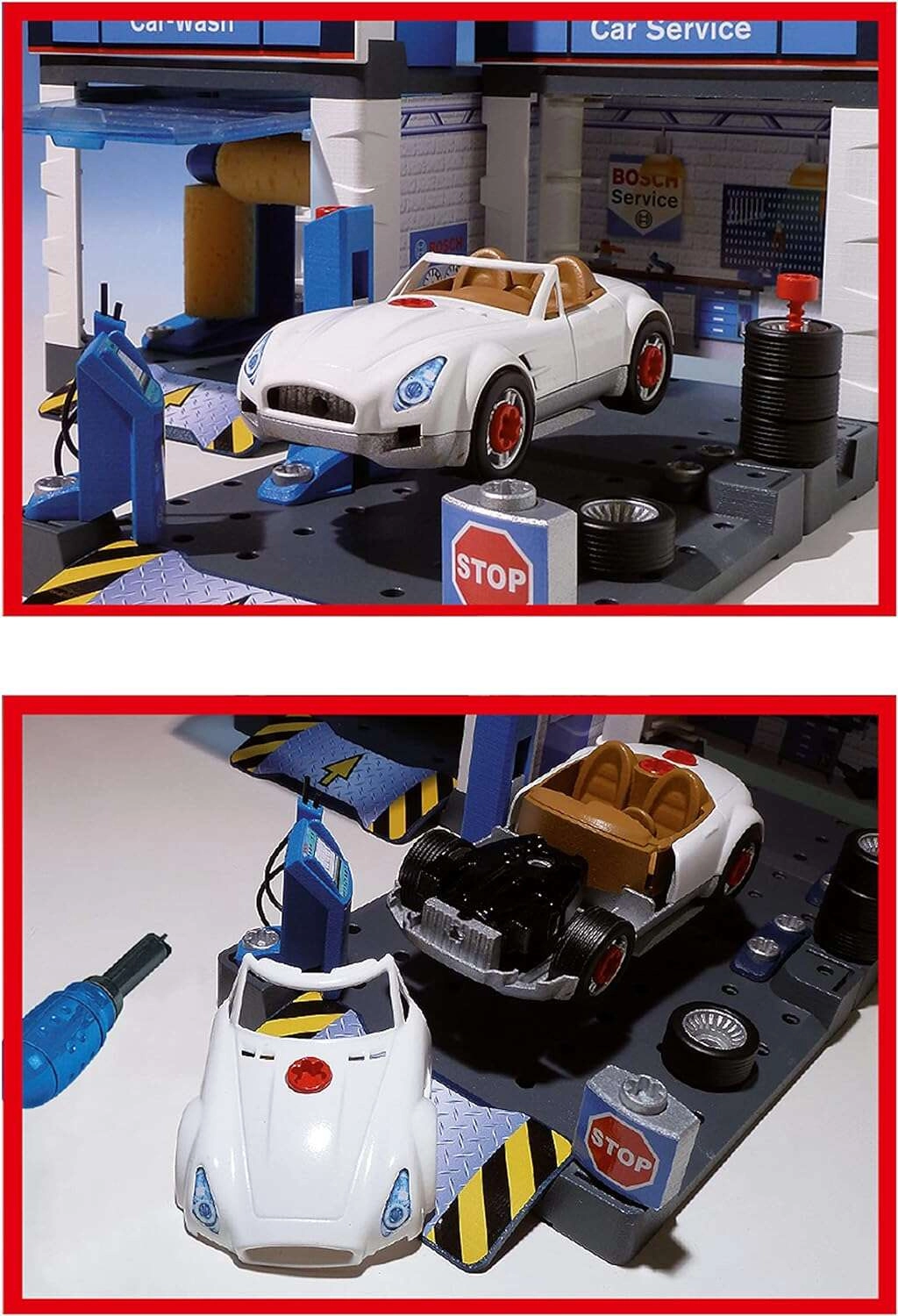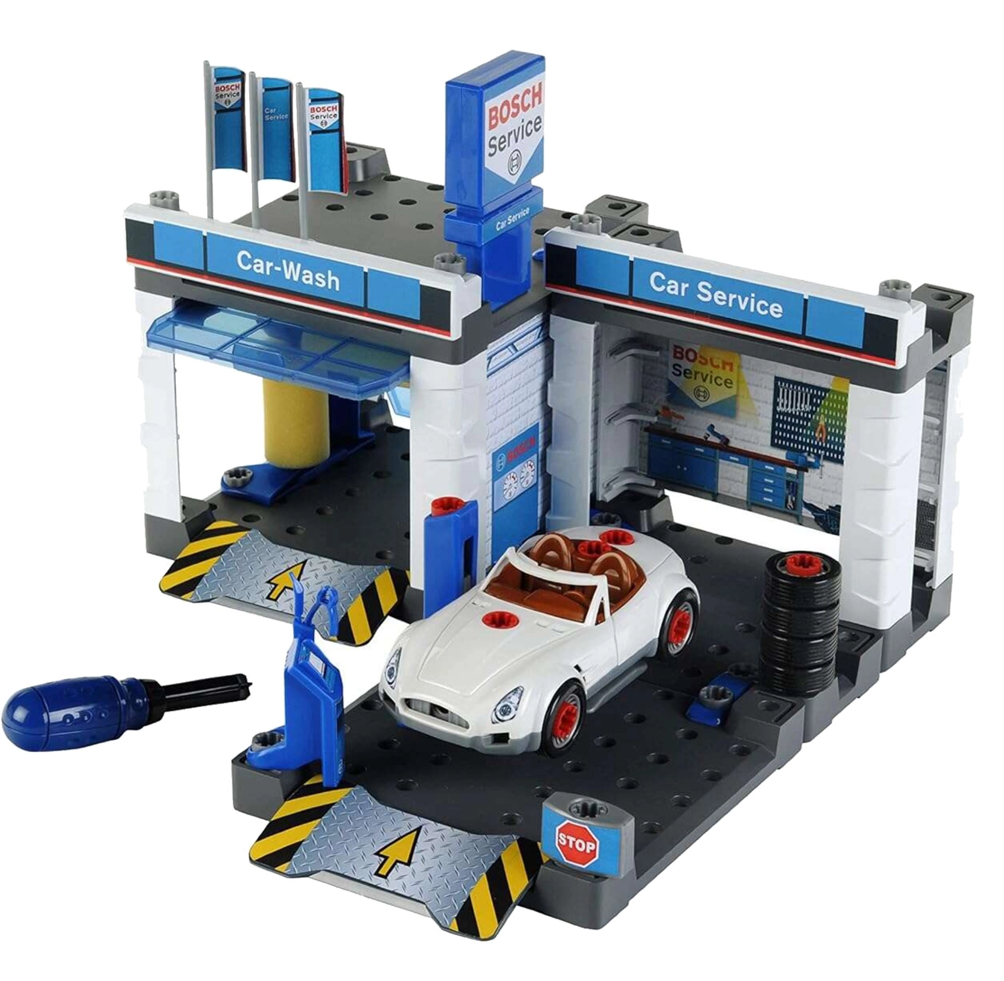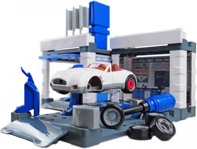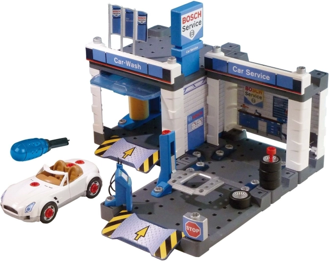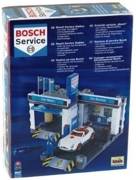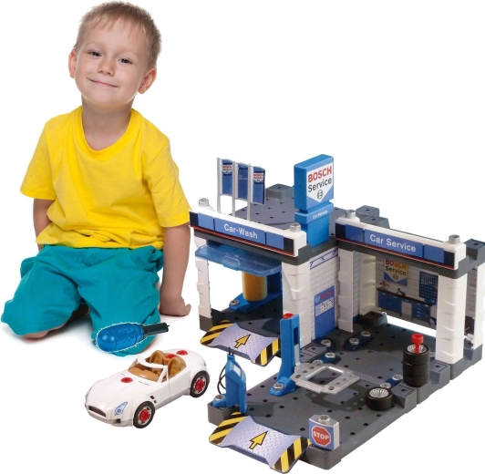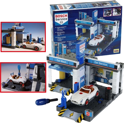 Denne servicestation med temaet BOSCH Service kombinerer bilvask, servicezone og montageværksted i ét. Med følger en hvid cabriolet, som børn kan skille ad og samle igen ved hjælp af den medfølgende skruetrækker. Bevægelige vaskevalser, løfteplatform og servicebord med “computer” giver en realistisk legeoplevelse.