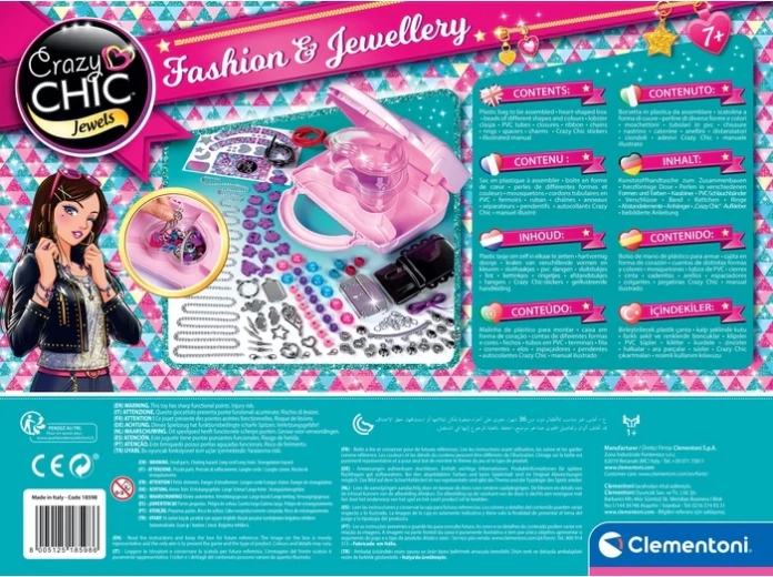 Oplev den kreative verden CRAZY CHIC og design smykker præcis efter din stil. Dette sjove sæt byder på et bredt udvalg af perler, kæder og tilbehør, så du nemt kan lave originale stykker, der fuldender ethvert outfit. Håndtasken fungerer ikke kun som smykkeskrin, men også som en modeaccessory, som du kan pynte med de medfølgende klistermærker.