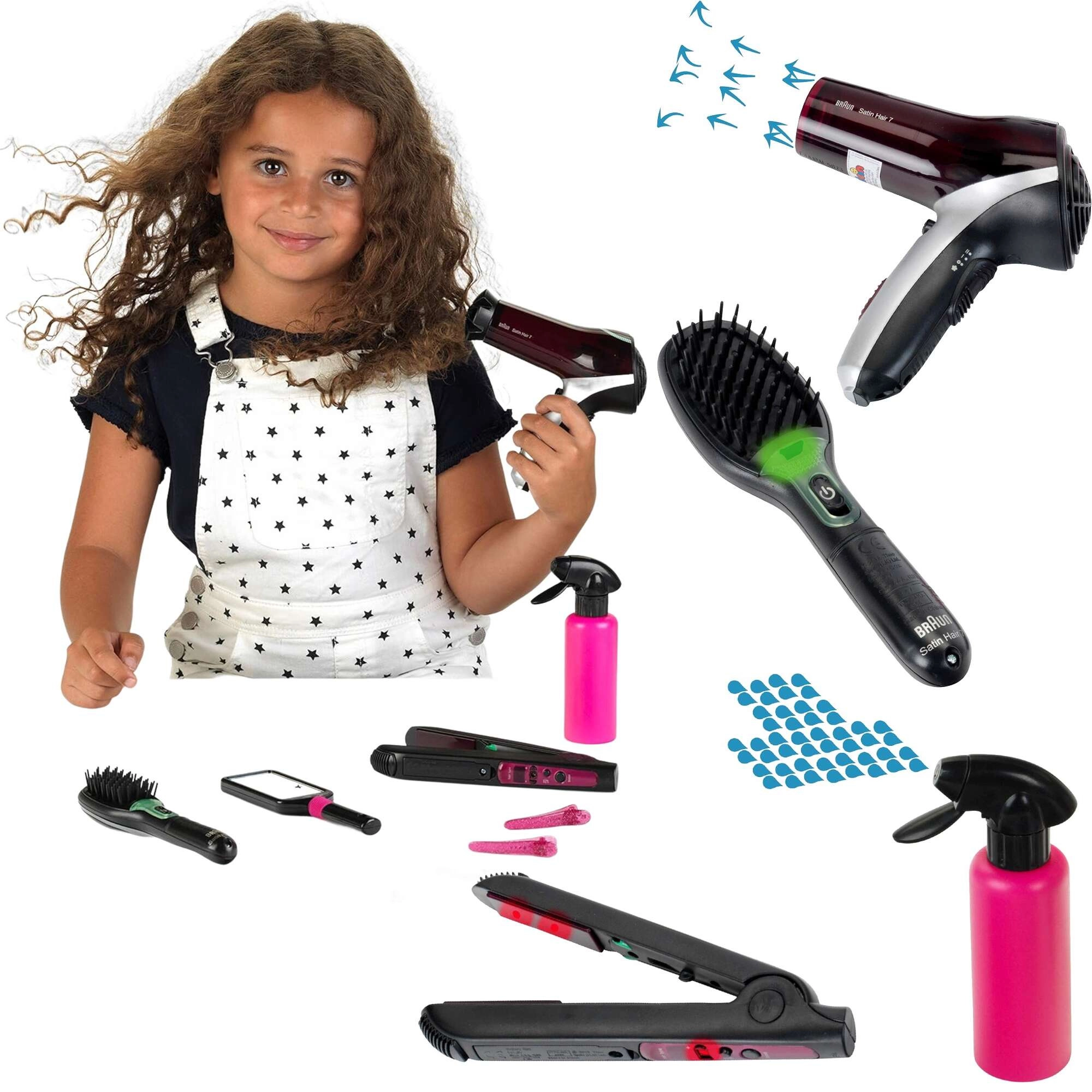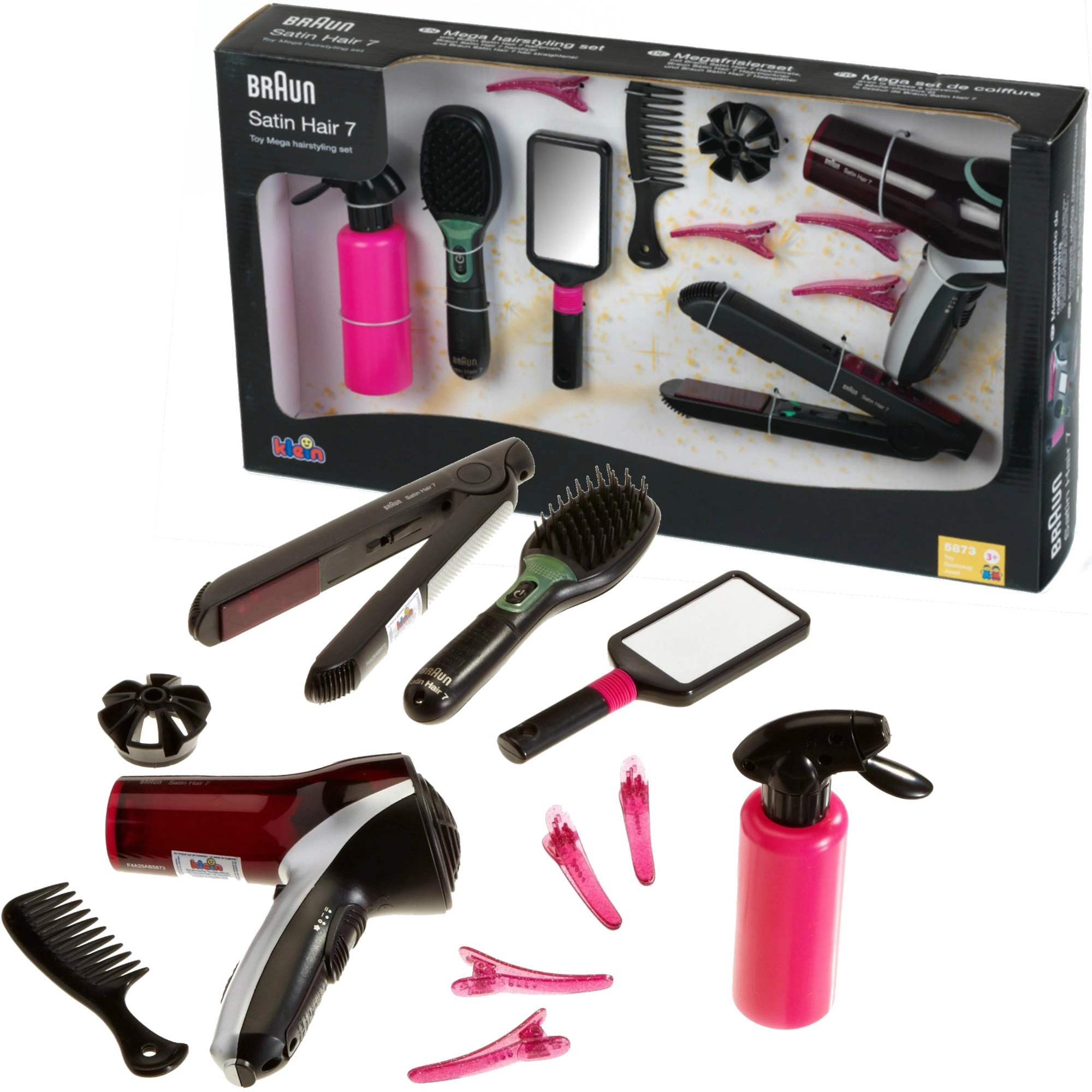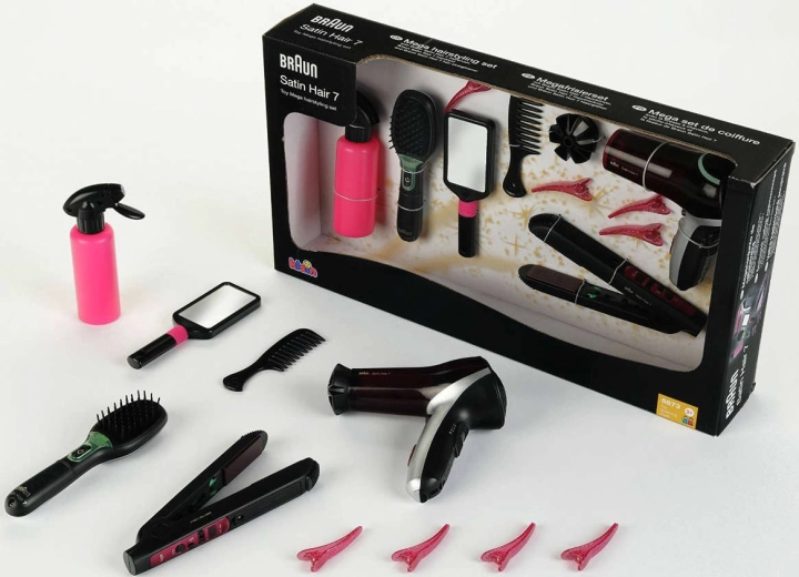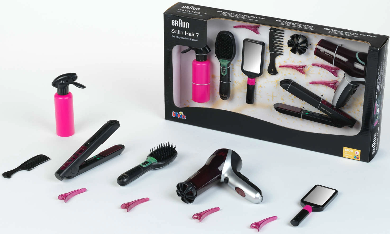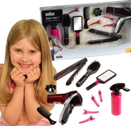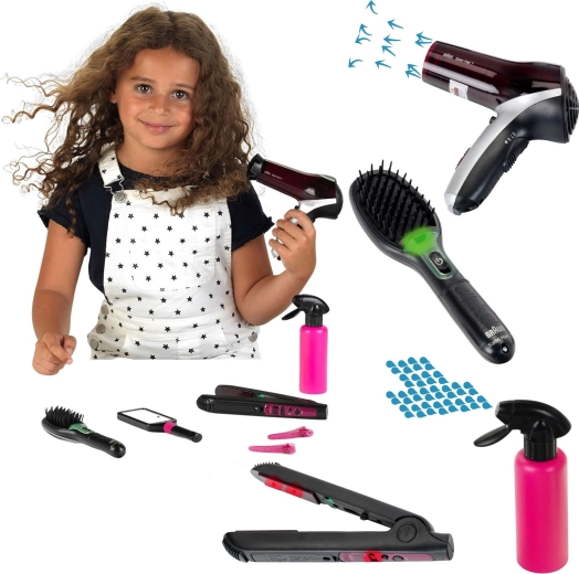 Stort frisørsæt inspireret af BRAUN Satin Hair-serien giver børn alt, hvad de behøver til stilfulde frisurer. Legetøjet er designet med fokus på sikkerhed og imiterer rigtige redskaber – føntørrer, glattejern og børste kører på batterier og skaber realistiske lys- og lydeffekter, mens de hverken producerer varme eller luftstrøm.