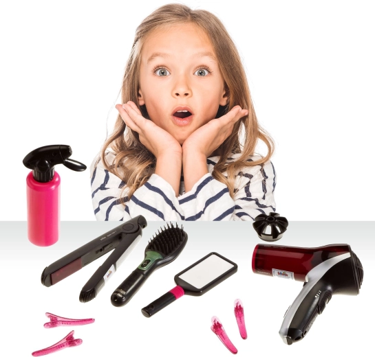 Føntørrer, glattejern og den batteridrevne børste skaber attraktive effekter, som bringer rigtige frisørredskaber tættere på børn – sikkert og uden varme.