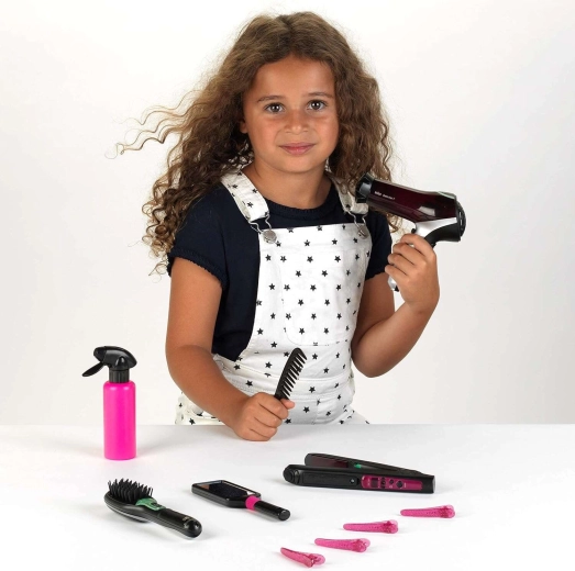 Pakken indeholder også praktisk tilbehør: spejl, kam, forstøver til vand (kan fyldes), udskifteligt mundstykke til føntørrer og 4 lyserøde glitrende hårspænder til nem opdeling og pynt af hår. Børn kan lege rigtig salon, udvikle fantasi, finmotorik og sociale færdigheder.