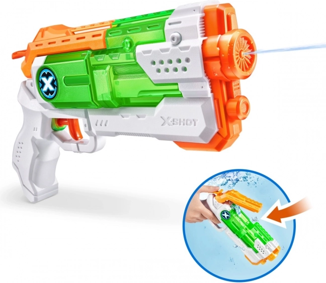I en vandkamp er der ingen tid at spilde, derfor er Zuru X-Shot Micro Fast-Fill udstyret med en tank på 170 ml og hurtigpåfyldningsfunktion. Dyp, træk, fyld med vand og sigt mod målet – alt på under 1 sekund! Sigt og affyr vandstråler op til 8 meters afstand.