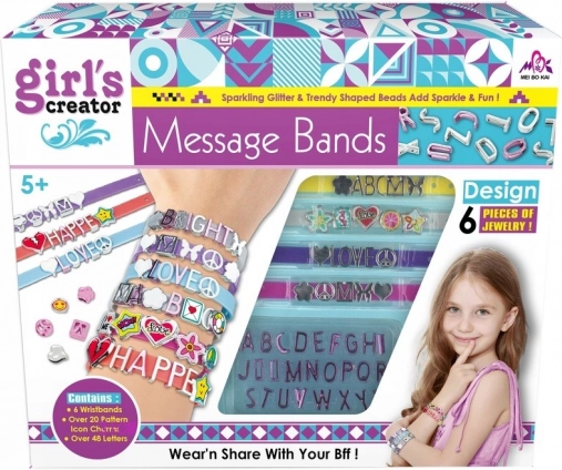 Et kreativt sæt børnearmbånd pyntet med forskellige symboler og bogstaver er en smuk pynt til små modeelskere. Farverige armbånd kan nemt matches med tøjet og understøtter samtidig fantasiudvikling og finmotorik under legen.