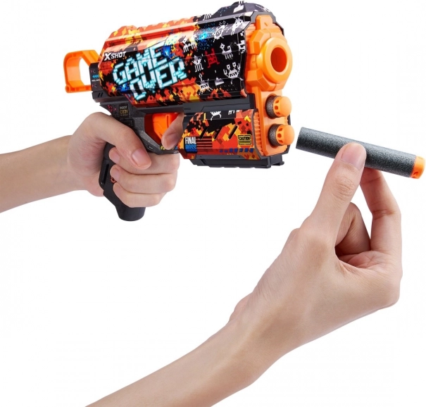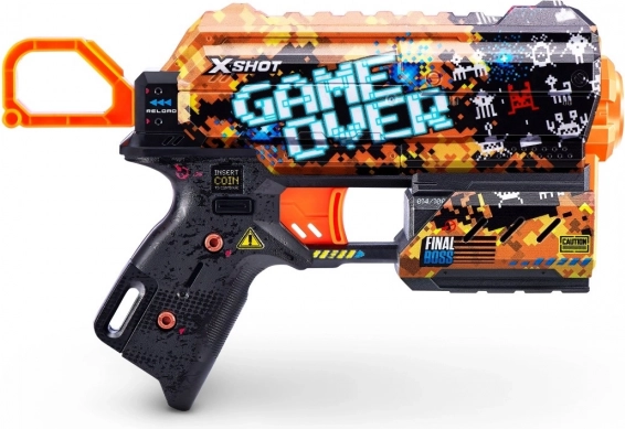 Bring videospilsstil ind i dine kampe med X-Shot Skins Flux i Game Over-motiv. Takket være den nyeste printteknologi ser blasteren ekstra attraktiv ud, mens ergonomiske former og en let konstruktion sikrer komfortabel håndtering selv ved længere leg.
