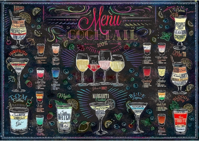 Nyd afslapning med et stilrent motiv af en cocktailmenu. Med 500 brikker er puslespillet ideelt til både begyndere og øvede, der søger en kombination af elegant design og en behagelig udfordring. Den særlige overflade mindsker genskin, så farverne træder tydeligere frem, og de enkelte brikker er lettere at skelne.
