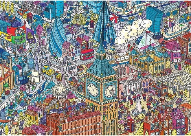 Trefl UFT puslespil Eye-Spy Time Travel: London 1000 brikker. Uendelig sammenkobling af motiver, kvalitets blå karton, unikke former, øko-emballage. Størrelse 68,3×48 cm.