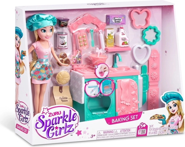 Sættet indeholder nødvendige elementer til leg, inklusive små legetøjsmadvarer, skåle, spatler og forme, der tillader realistisk efterligning af bagning. Åbn ovnen, læg kagerne i og lad som om, de bager! Med udskifteligt tøj kan dukken kombineres med andre figurer fra Sparkle Girlz-serien.