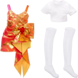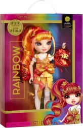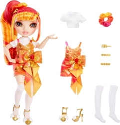Laurel stråler i en orange‑guld kombination med markante detaljer, der understreger seriens RAINBOW HIGH modemæssige karakter.