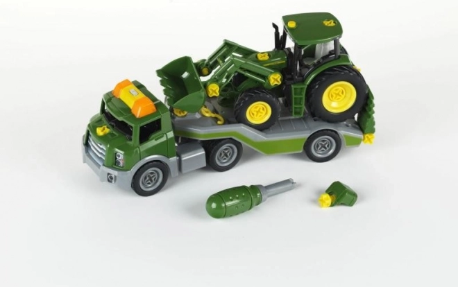 John Deere traktor til samling på bugsertrailer. Sjovt legetøj, der udvikler motorik og kreativitet, med et realistisk udseende.