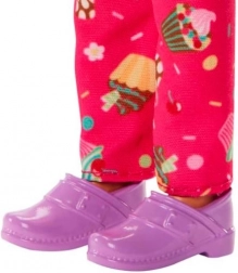 Barbie dukken er klædt i en hvid koksjakke med lyserøde detaljer og kokkehue, hvilket hjælper hende i rollen som konditor.