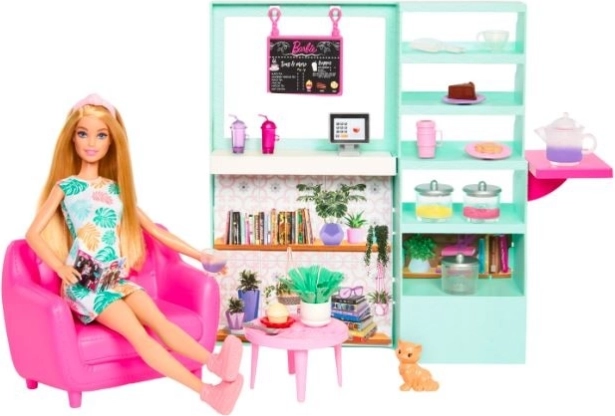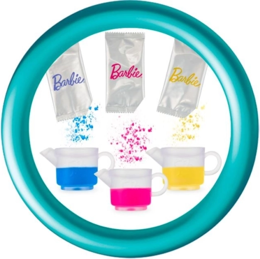 Leg café med Barbie, der i sættet har en stilfuld kjole med dekorativt bladmønster. En lille kattefigur holder dig med selskab og giver scenen ekstra charme. Farveskift og legende “smagsvariationer” i miljøet er nemme takket være de magiske tekander.