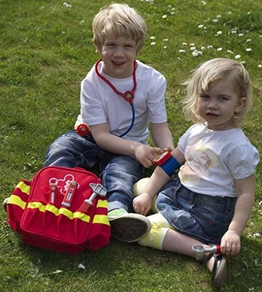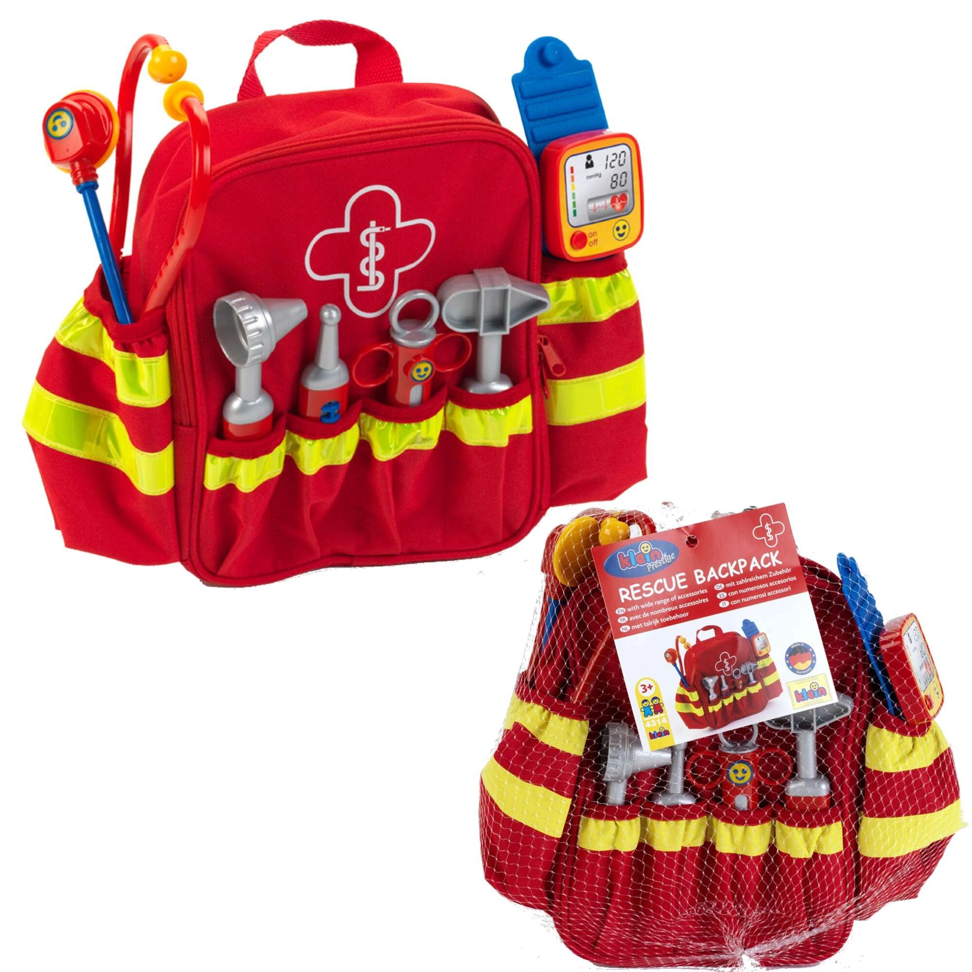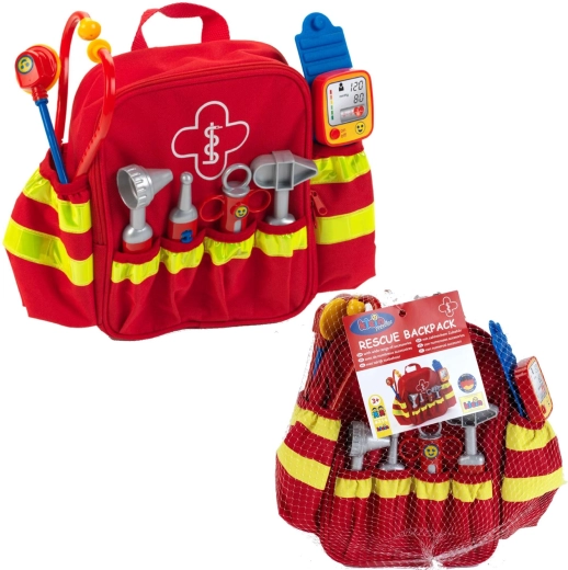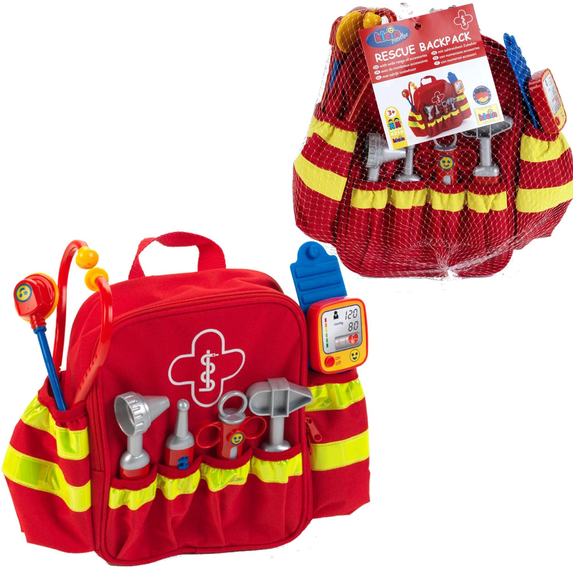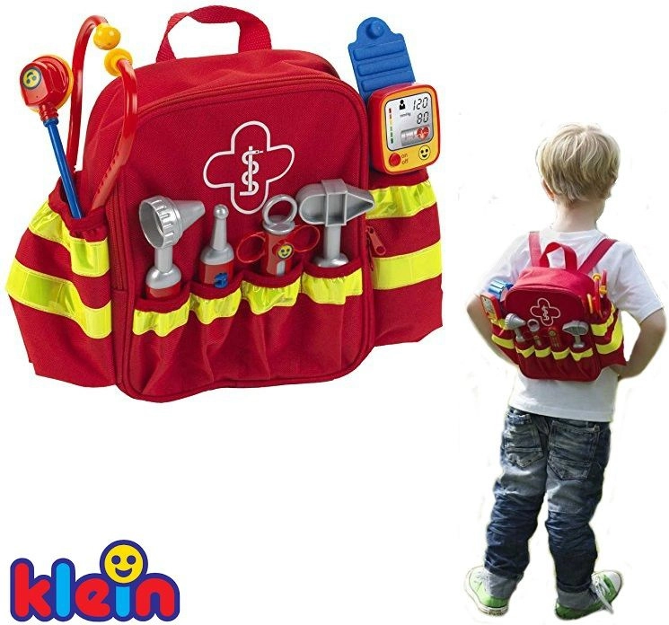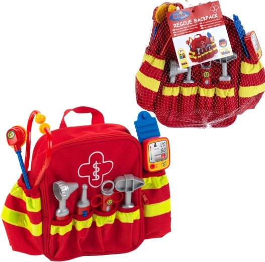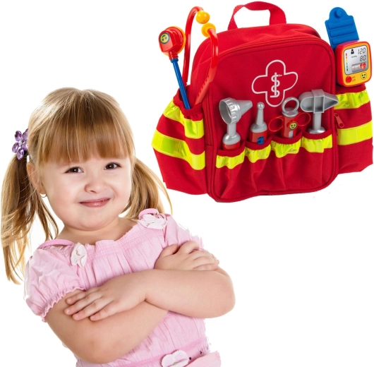 Opdag lægeudstyret i en kompakt rygsæk, som er designet til små hænder og stor fantasi. Den røde rygsæk med et tydeligt medicinsk kors og reflekterende striber øger synligheden ved udendørs leg, mens smarte lommer holder alle redskaber pænt inden for rækkevidde. Børn træner empati, finmotorik og kommunikationsevner gennem rollelege som læge.