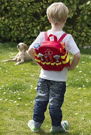 Den røde rygsæk med hvidt kors og reflekterende gule striber er let at se og sikker ved leg udendørs. Praktiske lommer holder værktøjerne lige ved hånden, og lynlåsen lukker alt sikkert inde.