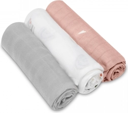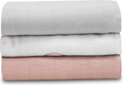 Tre farvematchende bleer i størrelsen 70 × 70 cm kan bruges til svøbning, ved amning, fodring og som underlag ved bleskift – både hjemme og på farten.