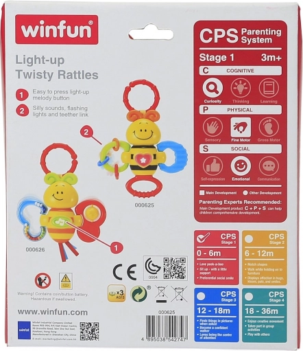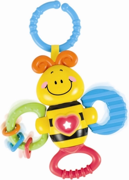 Denne farverige bi er en fantastisk første legetøj til de mindste. Når den rystes, afgiver den en behagelig raslen, og ved tryk på den centrale knap aktiveres melodier og et blinkende lys, som vækker nysgerrighed og stimulerer sanserne. Den ergonomiske form og flere ringe til at gribe gør det nemt for små hænder at holde om.