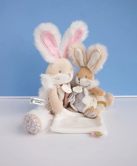 Et charmerende gavesæt med en plyskanin og et ultrablødt tæppe glæder babyen fra fødslen. Det tilbyder blidhed, komfort og en beroligende berøring, og stimulerer sanser og nysgerrighed. Leveres i en elegant gaveæske, fremstillet af premium-materialer og i overensstemmelse med europæiske CE-standarder.