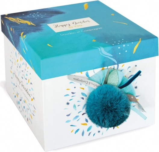 Den blødeste plyskanin DOUDOU, 25 cm høj, med en mørkeblå pompon er den ideelle ledsager for både spædbørn og større børn. Den tilbyder beroligende kontakt, premium materialer, sikkerhed i henhold til CE-standarder og nem vedligeholdelse. Perfekt som gave i en elegant æske.