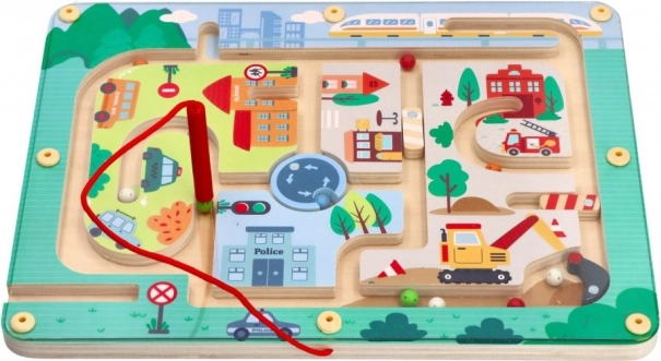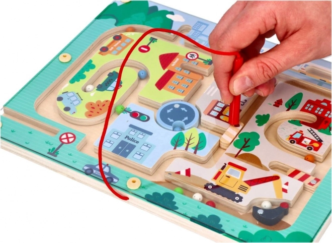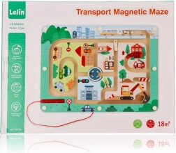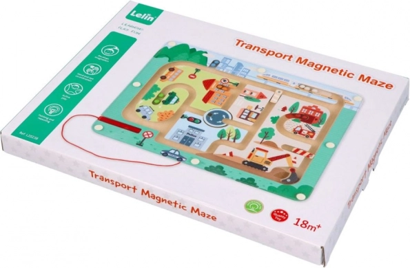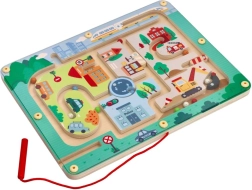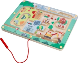 Oplev den sjove verden med Magnetisk labyrint Køretøjer, der er designet til at stimulere tænkning og fingerfærdighed. Dette legetøj er lavet af kvalitets træ og viser en farverig byscene med stier, bygninger og køretøjer. Ved hjælp af den røde magnetstav leder børn små kugler gennem banen, hvilket støtter deres manuelle færdigheder og hånd-øje-koordination.