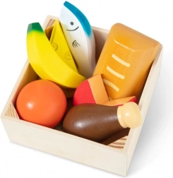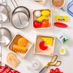 Dette træfødevaresæt indeholder fire små kasser, der gemmer på forskellige fødevarer som mælk, ost og brød. Det er designet til kreativ leg, der hjælper børn med at udvikle finmotorik og fantasi.