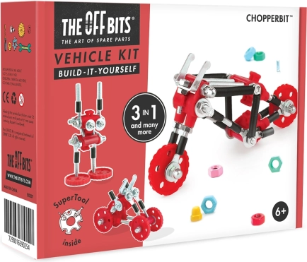 The OffBits ChopperBit byggesæt giver sjov og lærerig skabelse for børn fra 6 år. Af de medfølgende skruer, hjul og smarte forbindelser bygger du ChopperBit, robotten TechBit eller BumperBit – og derefter kan du kaste dig ud i dine egne originale idéer. Delene kan kombineres med almindelige materialer fra hjemmet, så de kreative muligheder er uden grænser.