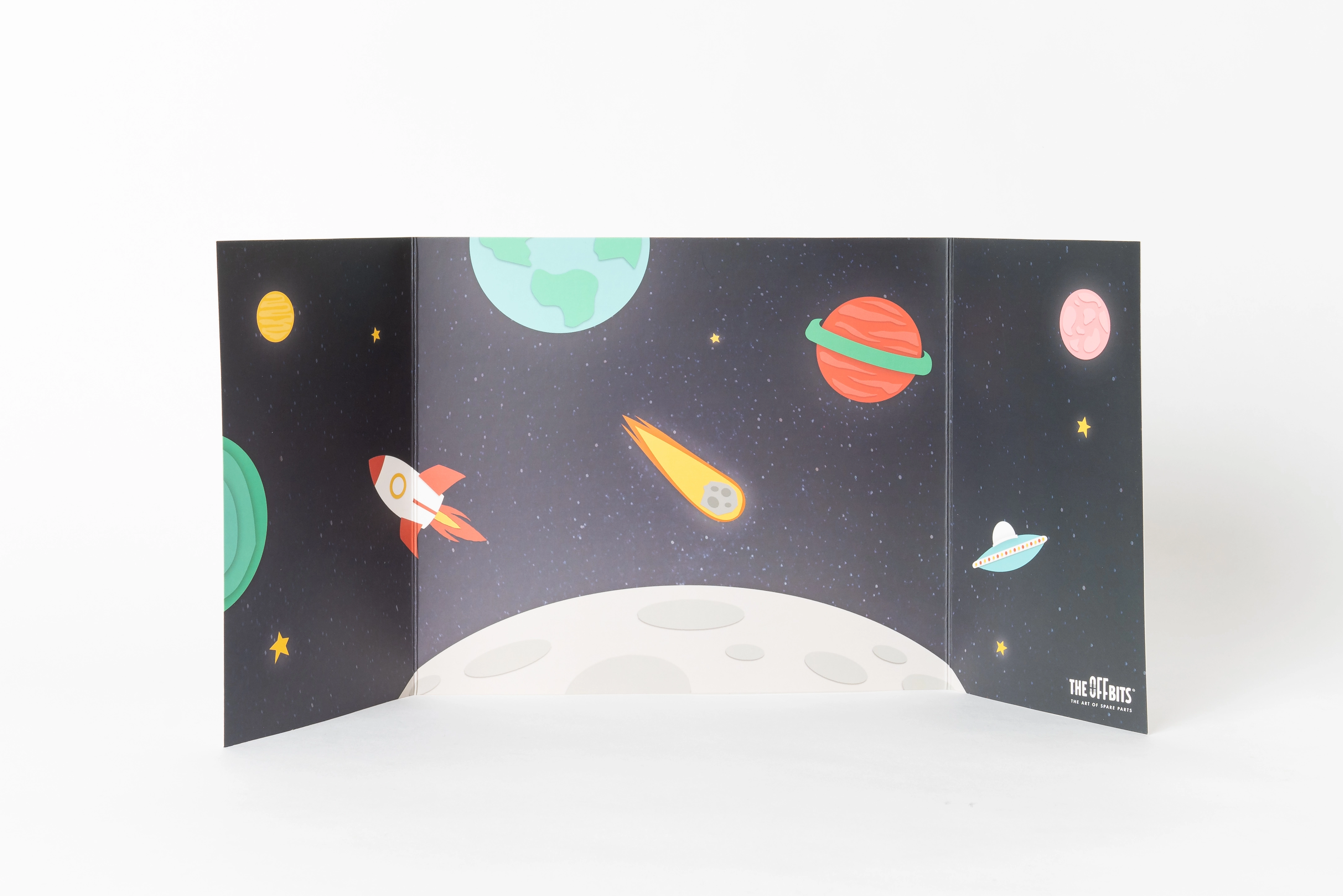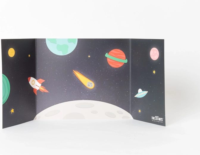 Det foldbare kartonbaggrund med rumtema skaber en imponerende ramme til leg og fotografering af de færdige modeller. Den stabile tredelte konstruktion udvider legeverdenen.
