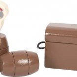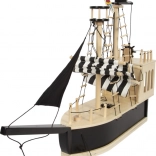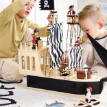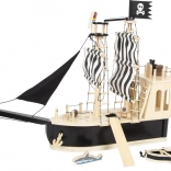 Der medfølger masser af tilbehør: to bevægelige pirater (passer til figurer op til 12 cm), jolle til strandture, haj til spændende forfølgelser, papegøje, skattekiste, to tønder, planke, flag samt en fungerende trækanon med tre filtkugler. Ræling og master kan nemt afmonteres for pladsbesparende opbevaring.