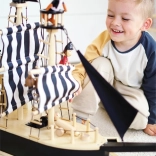 Dette store piratskib er designet til eventyrlige opdagelseslege. Takket være gennemtænkte funktioner – hævbare og sænkbare sejl, bevægeligt anker, faldedøre og bagluge – byder det på utallige legescenarier. Skibet er fremstillet af kvalitets træ kombineret med tekstil og filt, hvilket sikrer holdbarhed og lang levetid.
