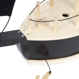 Hævbare sejl, rebstiger, kran med krog, anker på spil, faldedøre og bageste luge. Alt til realistisk piratleg.