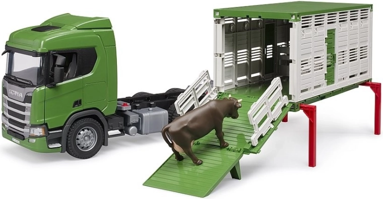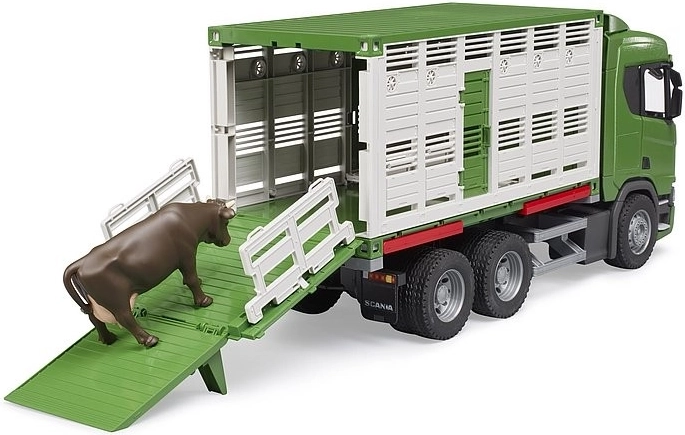Den realistiske BRUDER dyretransportør på SCANIA-chassis glæder små landmænd med smarte funktioner og robust udførelse. Den tilbyder nedklappelige og udtrækkelige ramper, åbnebare døre, klapbare spejle samt indre opdelingsporte. Medfølger gør en ko-figur, bløde dækbaner for stille kørsel og mulighed for at supplere med en lys- og lydmodul for en endnu større legeoplevelse.